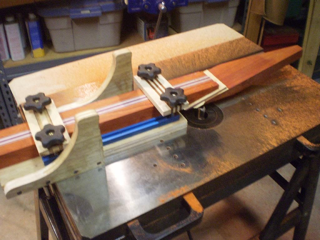This is the sled I am using to clean up the face of the scarf. In the past I have used the jointer but after last years tear-out incident and a few mishaps on the large sander I decided to try something different.